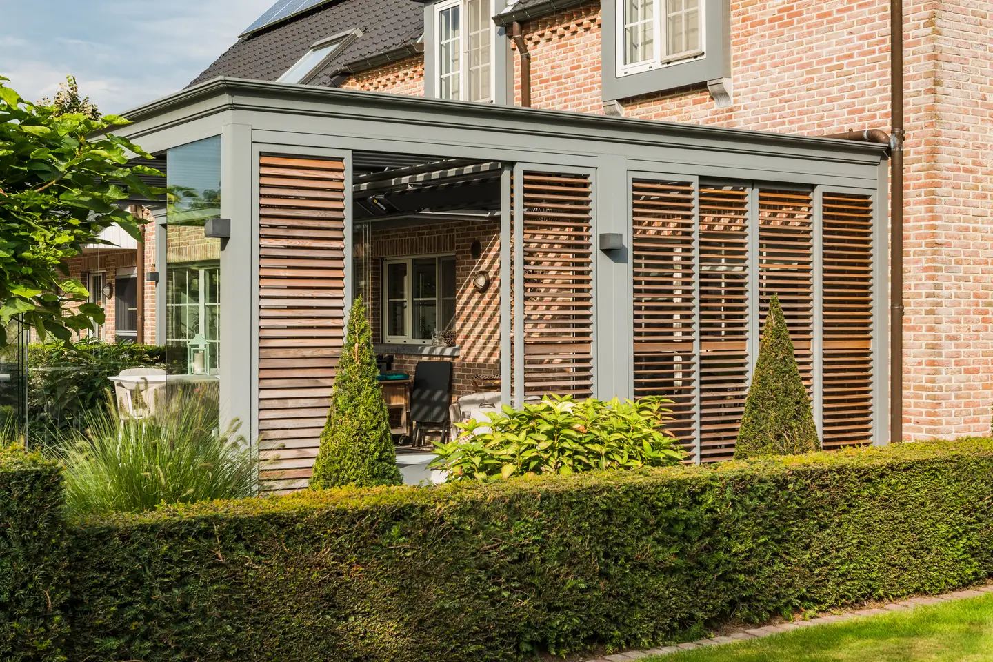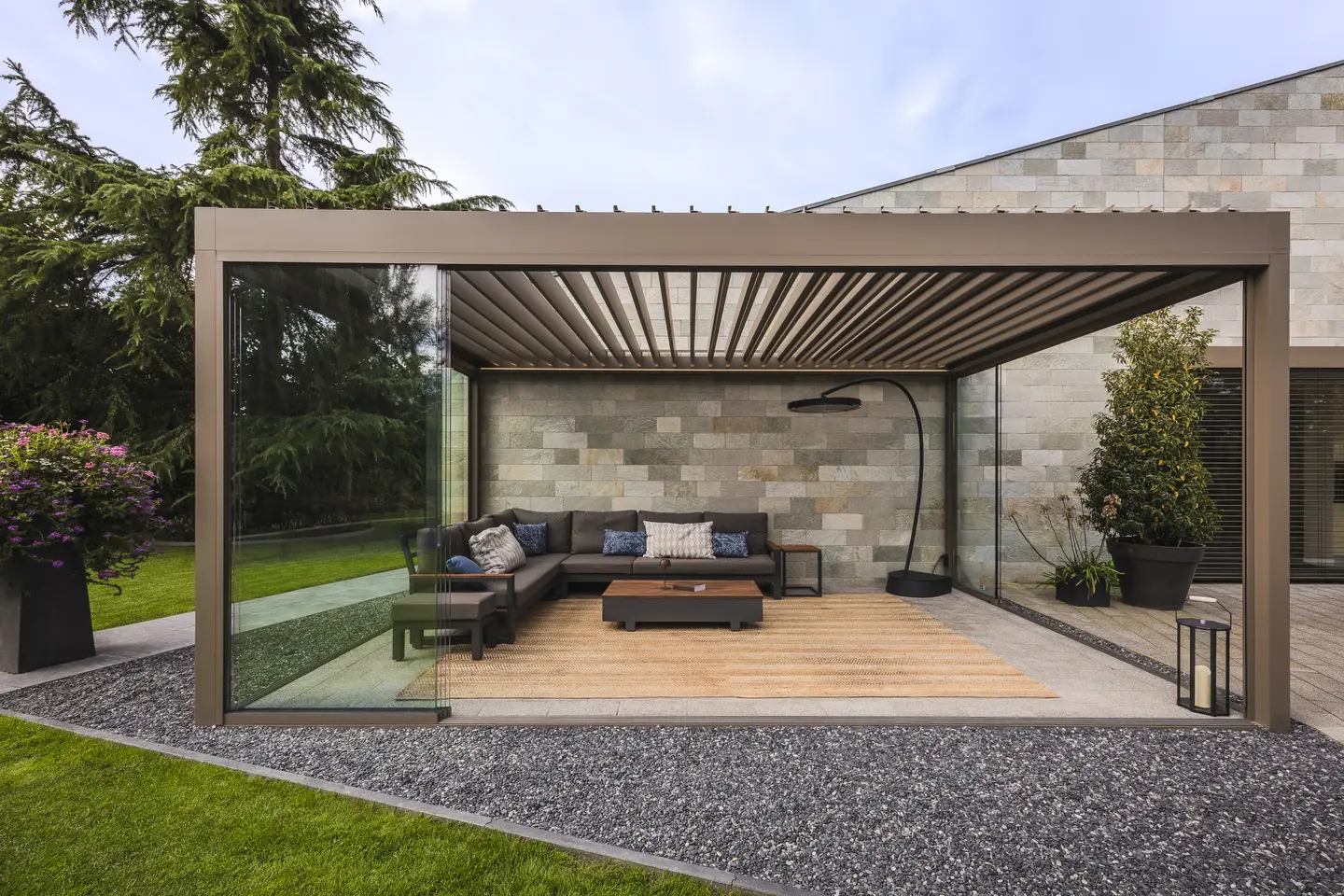 Lames orientables ou toiture fixe Canvas, stores, rideaux et panneaux coulissants : l'Algarve vous laisse le choix pour maîtriser la lumière naturelle.