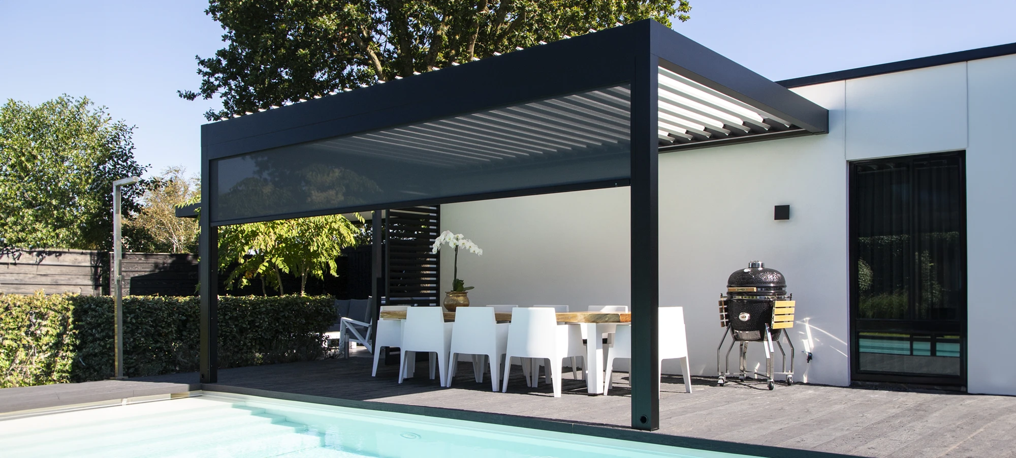 Lames orientables ou toiture fixe Canvas, stores, rideaux et panneaux coulissants : l'Algarve vous laisse le choix pour maîtriser la lumière naturelle.